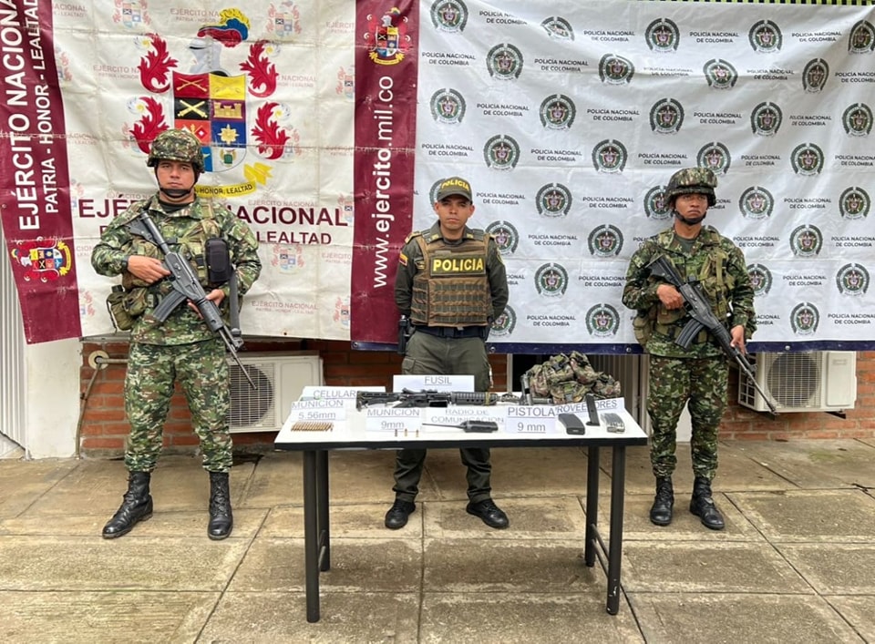 Durante el procedimiento fueron hallados un fusil tipo M4, una pistola marca Córdova, munición de diferentes calibres y otros elementos utilizados para actividades delictivas, tales como dispositivos de comunicación y prendas de uso privativo de las fuerzas militares.