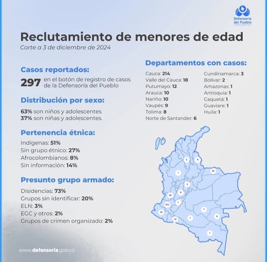 Un preocupante informe de la Defensoría del Pueblo reveló que el departamento del Cauca lidera las cifras de reclutamiento forzado de menores en el país, con 214 casos registrados a corte del 3 de diciembre de 2024. Este dato representa el 72% del total nacional, que asciende a 297 casos.