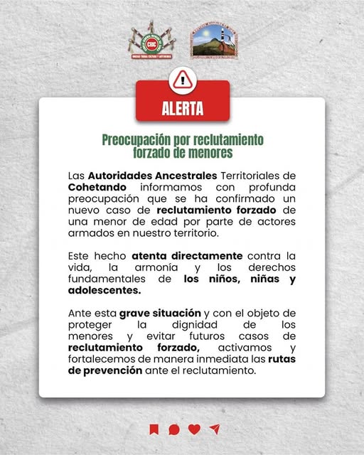Las Autoridades Ancestrales Territoriales de Cohetando, en el municipio de Páez, Cauca, informan con profunda preocupación la confirmación de un nuevo caso de reclutamiento forzado de una menor de edad, perpetrado por actores armados presentes en el territorio.