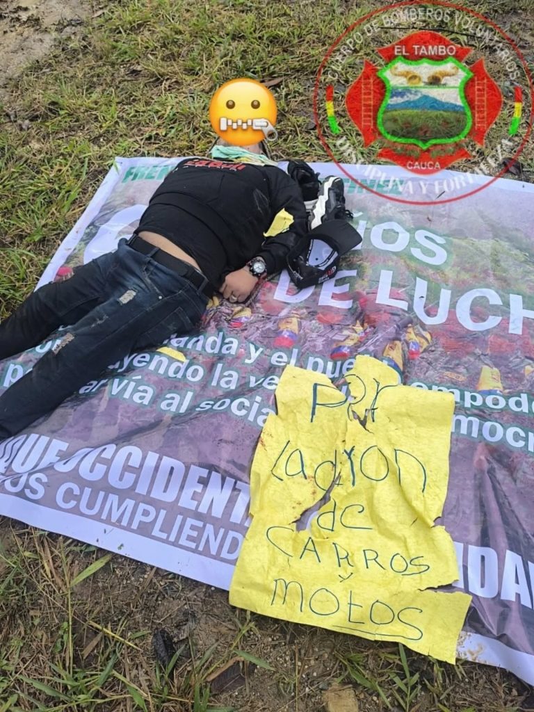 Junto al cuerpo, las autoridades encontraron un cartel con el mensaje: “por ladrón de carros y motos”, y una pancarta alusiva a las disidencias de las FARC GAO-R Jaime Martínez.