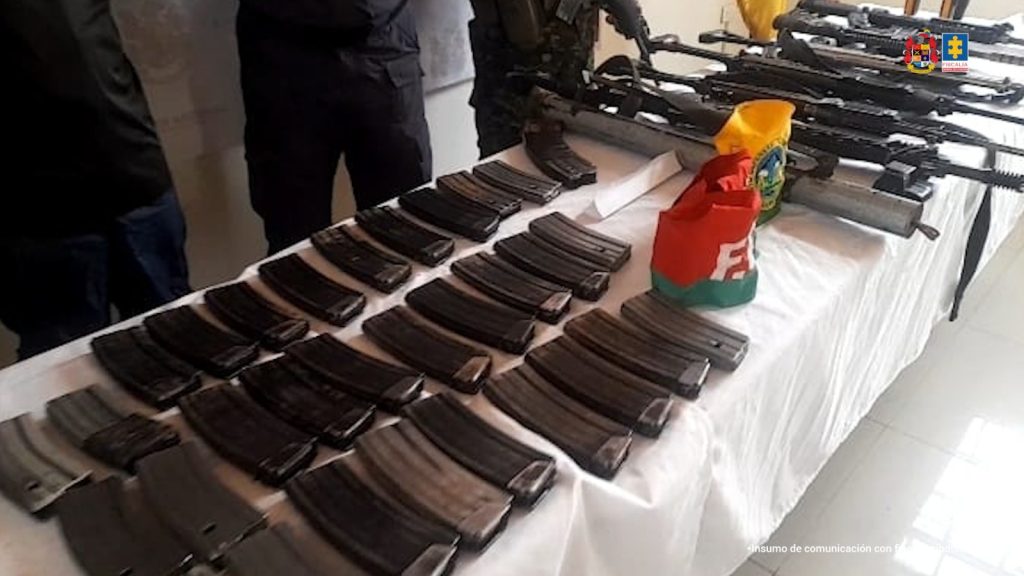 Durante la diligencia, tropas del Ejército Nacional ubicaron en una vivienda seis fusiles, una escopeta calibre 12, treinta proveedores para fusil, un mortero de fabricación artesanal y 1.157 cartuchos de distintos calibres. También fueron encontrados siete chalecos multipropósito y tres radios de comunicación.