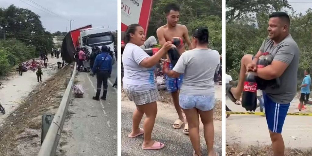 A plena luz del día, los individuos forzaron el vehículo y comenzaron a sustraer la mercancía. Las imágenes muestran cómo varias personas cargan cajas y botellas sin ningún tipo de control, mientras otros observan o graban la escena con sus teléfonos móviles.