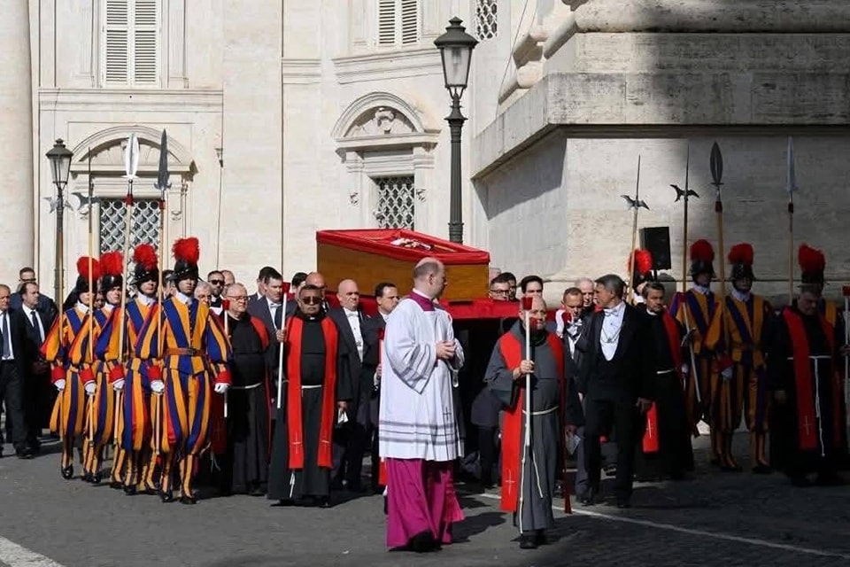 La procesión fúnebre comenzó a las 9:00 de la mañana, encabezada por el cardenal camarlengo Kevin Joseph Farrell y escoltada por miembros del Colegio Cardenalicio, secretarios pontificios y catorce funcionarios vaticanos que portaban el féretro. En formación impecable, ocho alabarderos de la Guardia Suiza rindieron honores durante todo el recorrido, que culminó con la entrada del ataúd por la puerta central de la basílica.